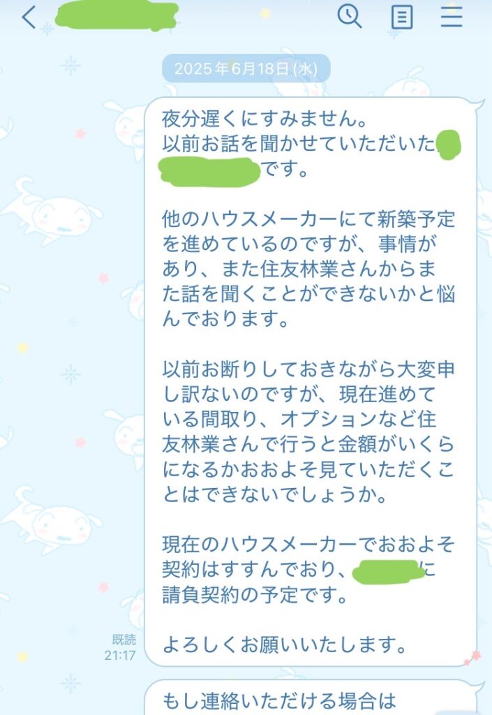 そんな不安が限界に達し、思い切って住友林業に連絡することにしました。